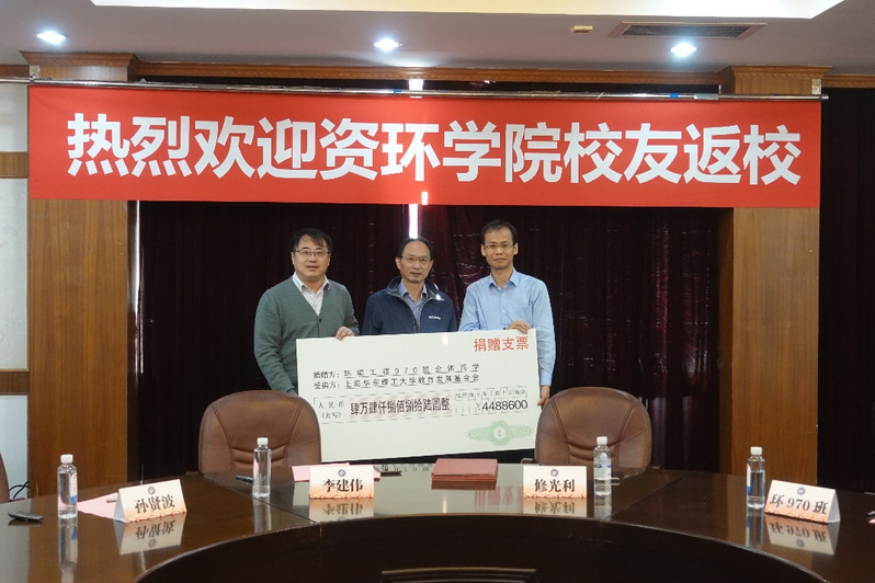 校友刘军代表环970班全体同学进行捐赠,李建伟和修光利共同接受了捐赠支票,并向刘军颁发了捐赠证书。