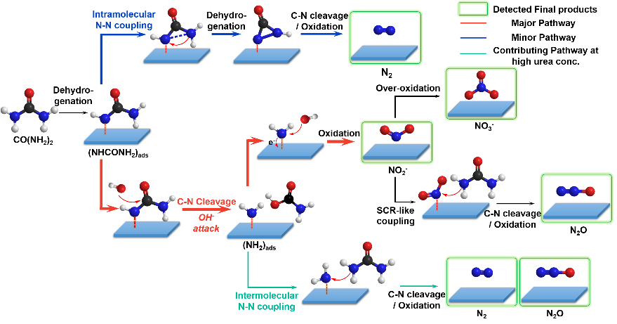 然而,前期大量研究仅关注尿素电化学产氢的阴极过程,而忽略了活性镍基催化剂亲氧终端结构、尿素多配位吸附中心、多步电子质子耦合转化等众多因素在阳极上的复杂作用。事实上,尿素分子在阳极发生复杂的转化过程,产生硝态氮、亚硝氮等过度氧化产物,远远偏离了绿色反应的初衷;此外,目前对于碱性尿素氧化机理认识不足,严重阻延了此类应用的发展。