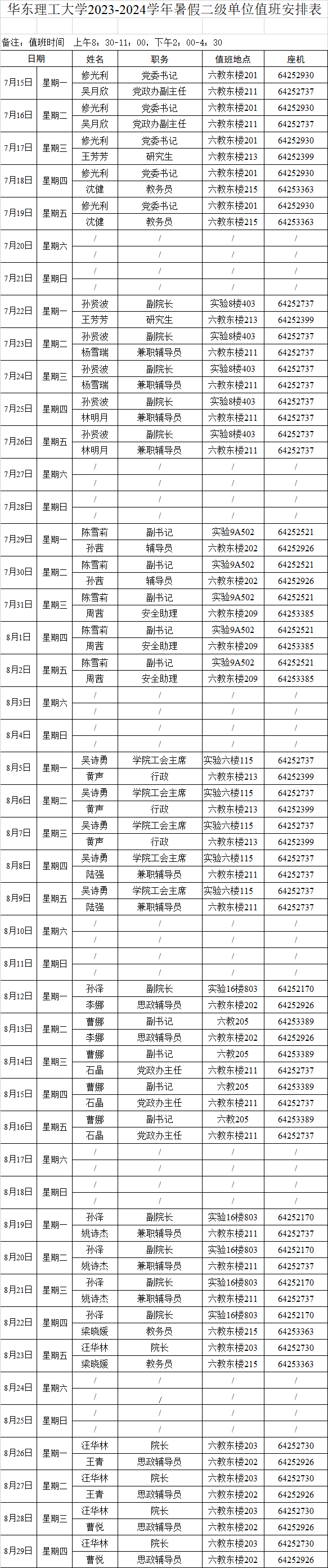 【值班安排】44118太阳成城集团2023-2024学年暑假44118太阳成城集团值班安排表